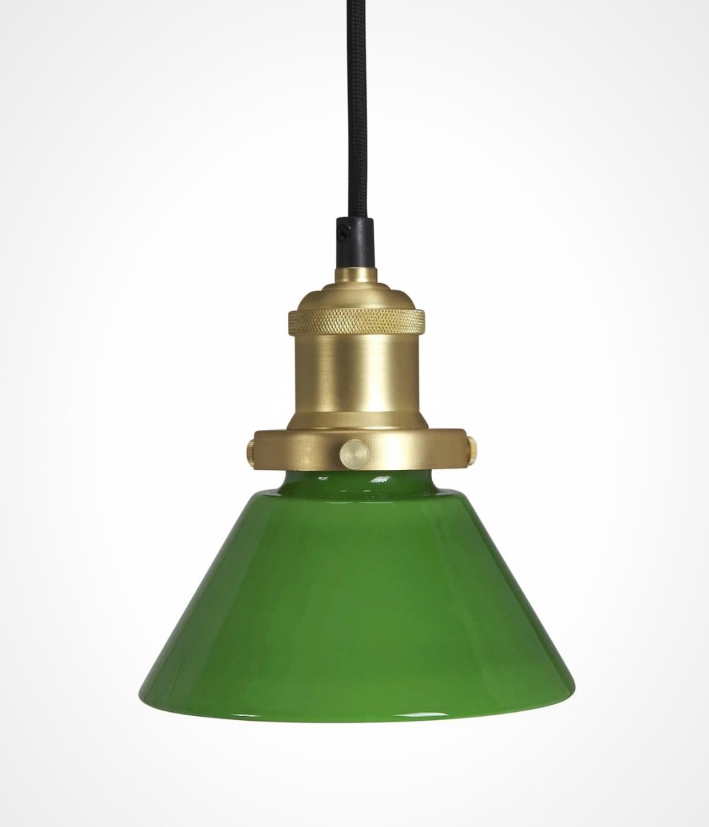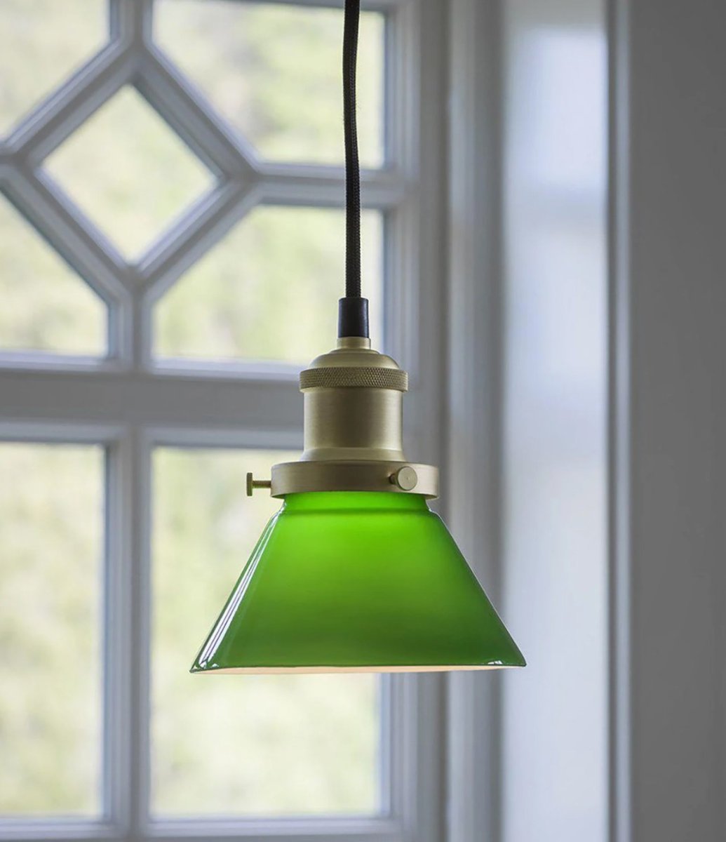 August skomakarlampa i klassisk stil. Lampskärm i grönt glas och lamphållare i metall med borstad mässingsfärg. Denna nätta lampa passar bra i grunda fönster men även över köksbänken. Lampan kommer med en svart textilkabel som är 3 meter lång och har väggkontakt och strömbrytare. En lampa i klassiskt Carl Larsson stuk.