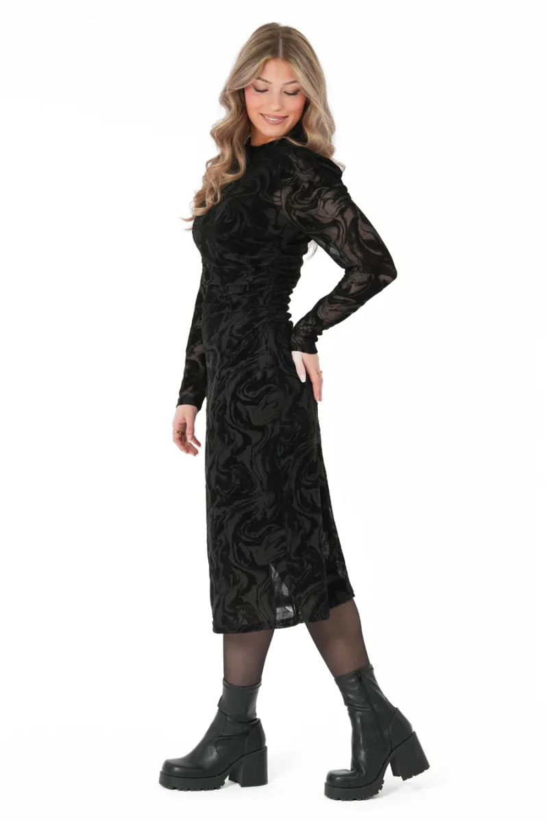 Lyxig mesh-klänning med vackert swirlmönster i ton-i-ton. Tajt passform och hellånga ärmar med puff.