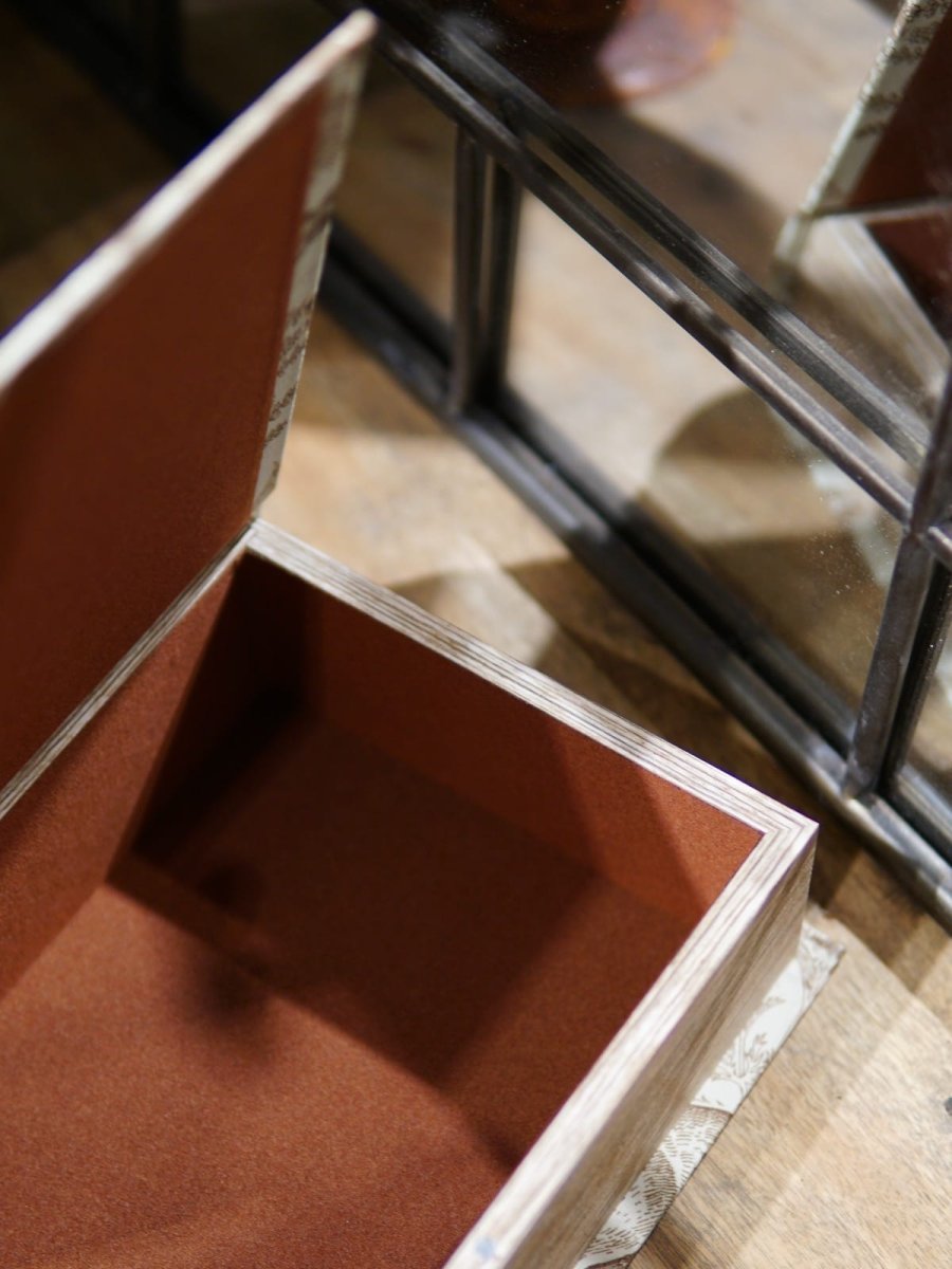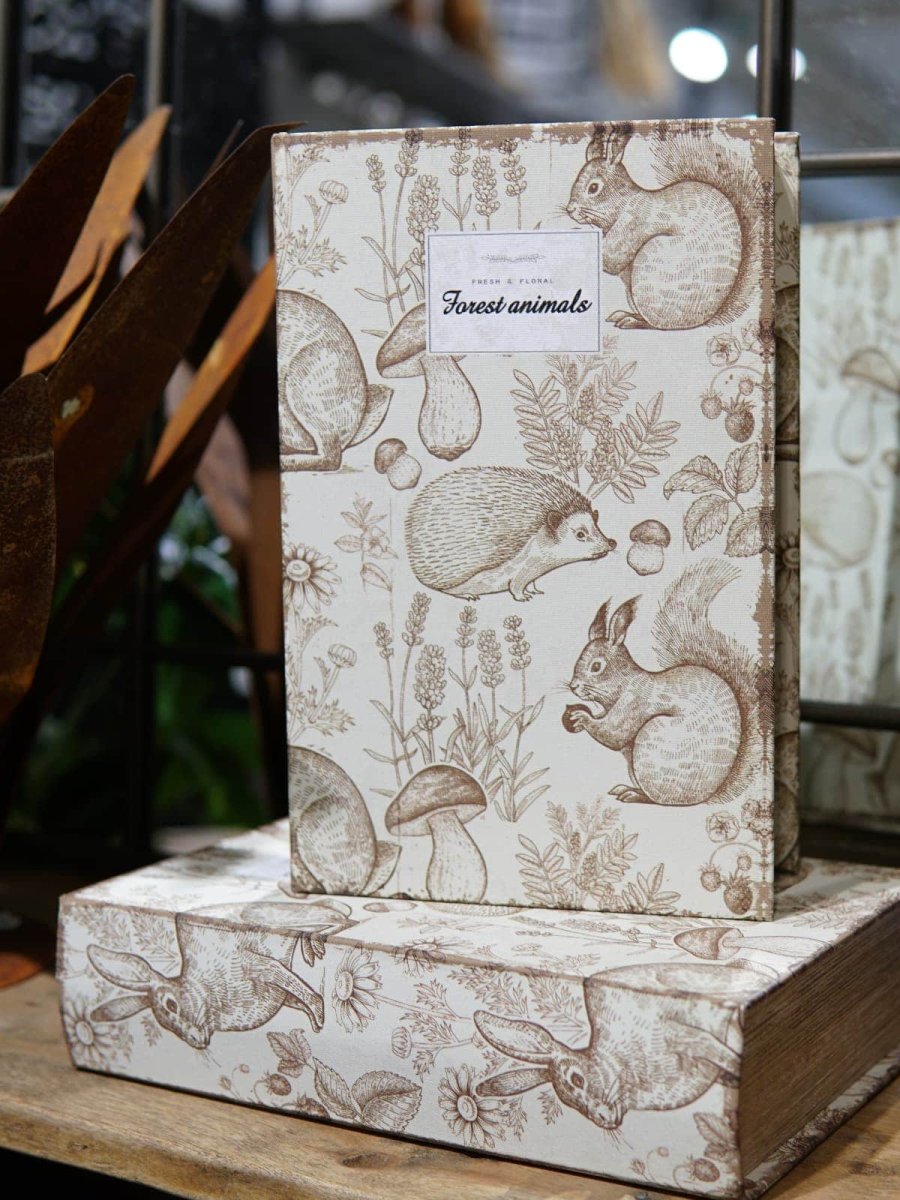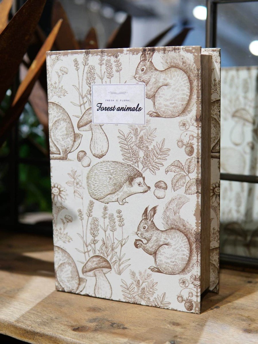 Boklåda som vackert förvarar till exempel smycken, minnen och småelektronik. Alldeles ljuvligt omslag med myllrande skogsliv.