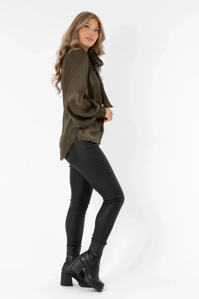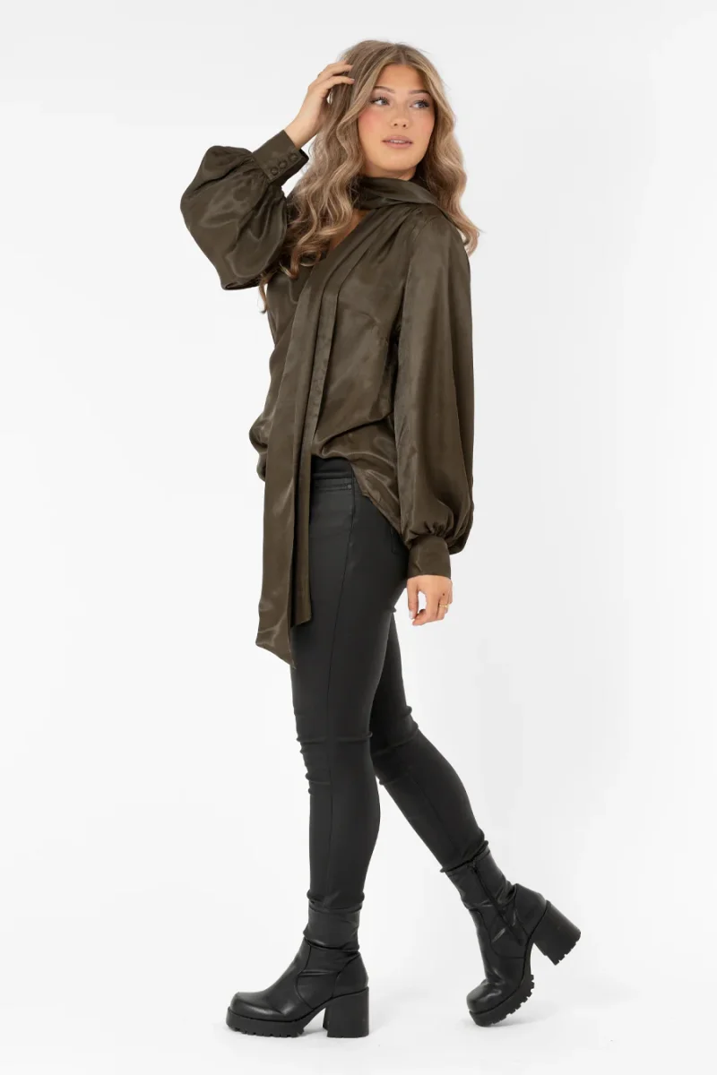 Knytblus i lyxig viskossatin, gjord i ledig passform. V-ringad hals med breda knytband och volymiös ärm med hög manschett.