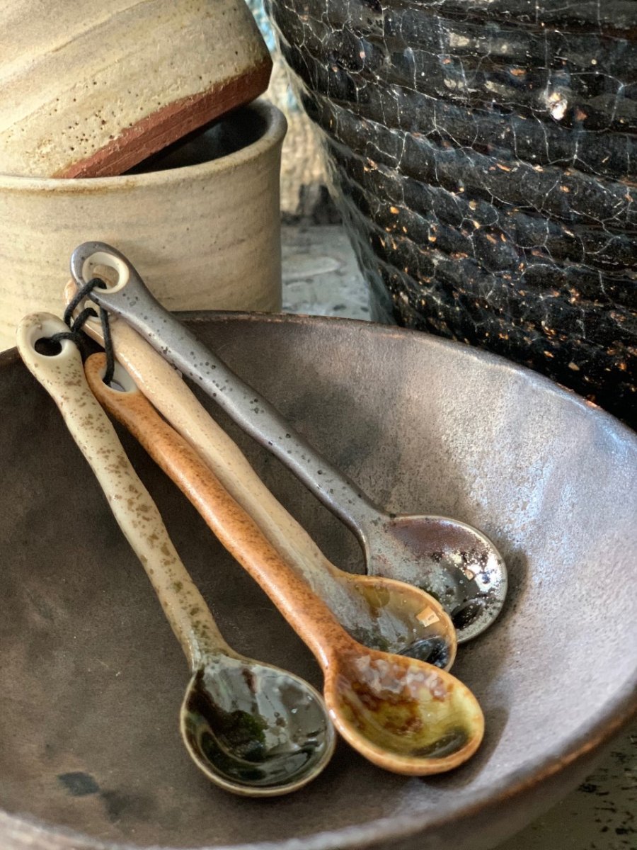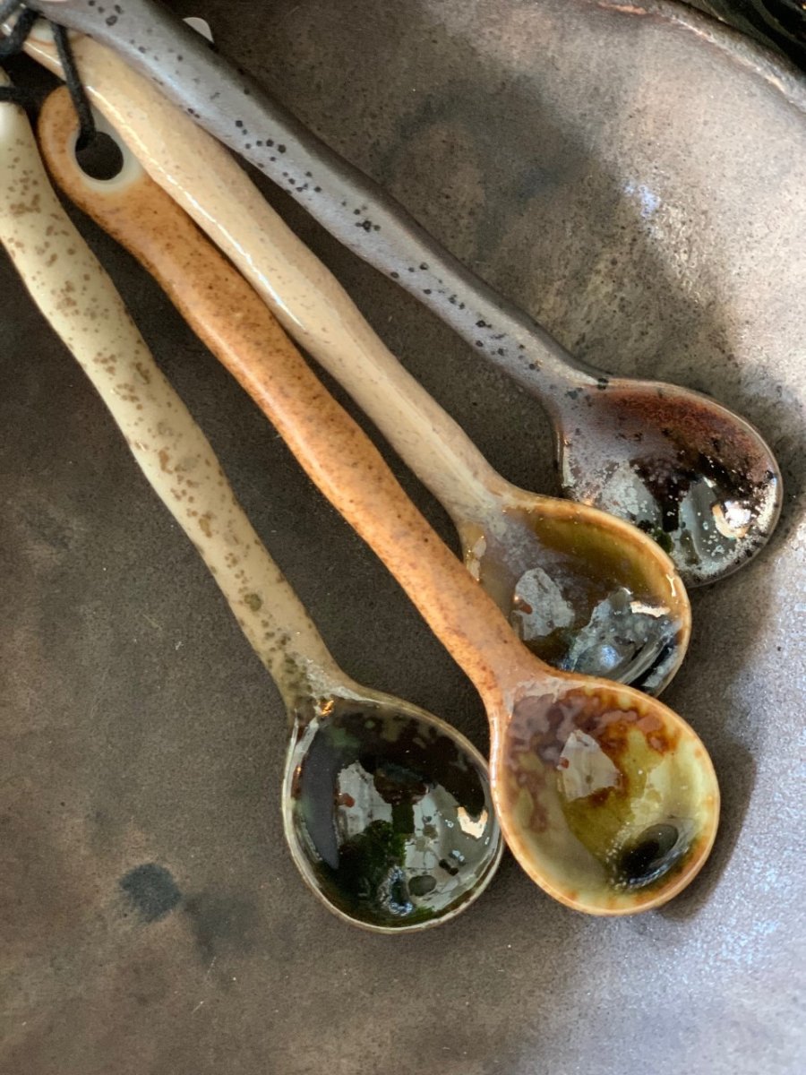 En uppsättning med 4 teskedar gjorda av japansk keramik i jordnära färger. Skedarna är handgjorda vilket gör att alla ser olika ut och därmed kan skilja sig från bilden.