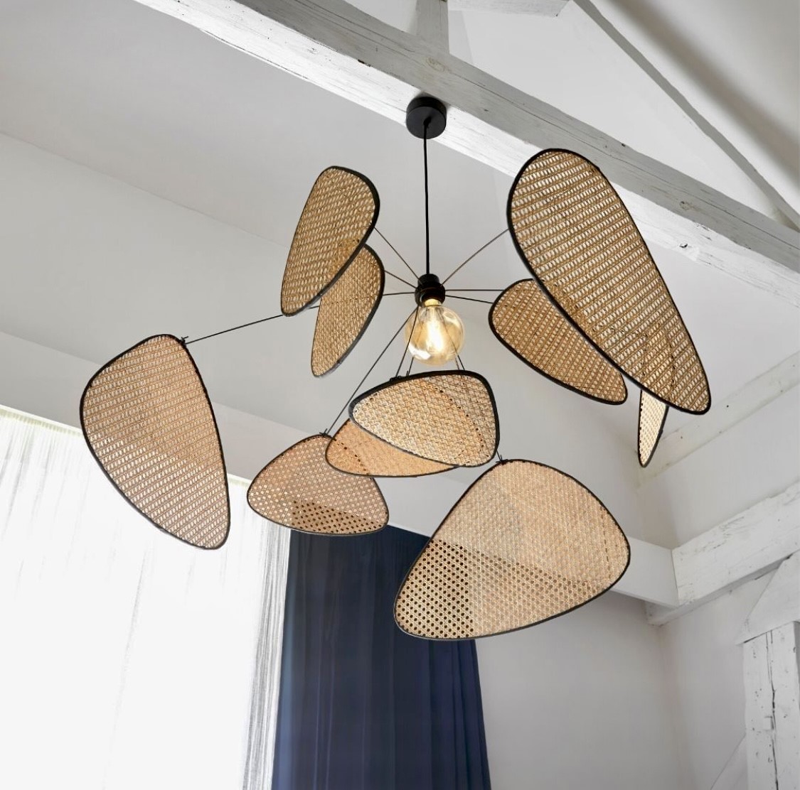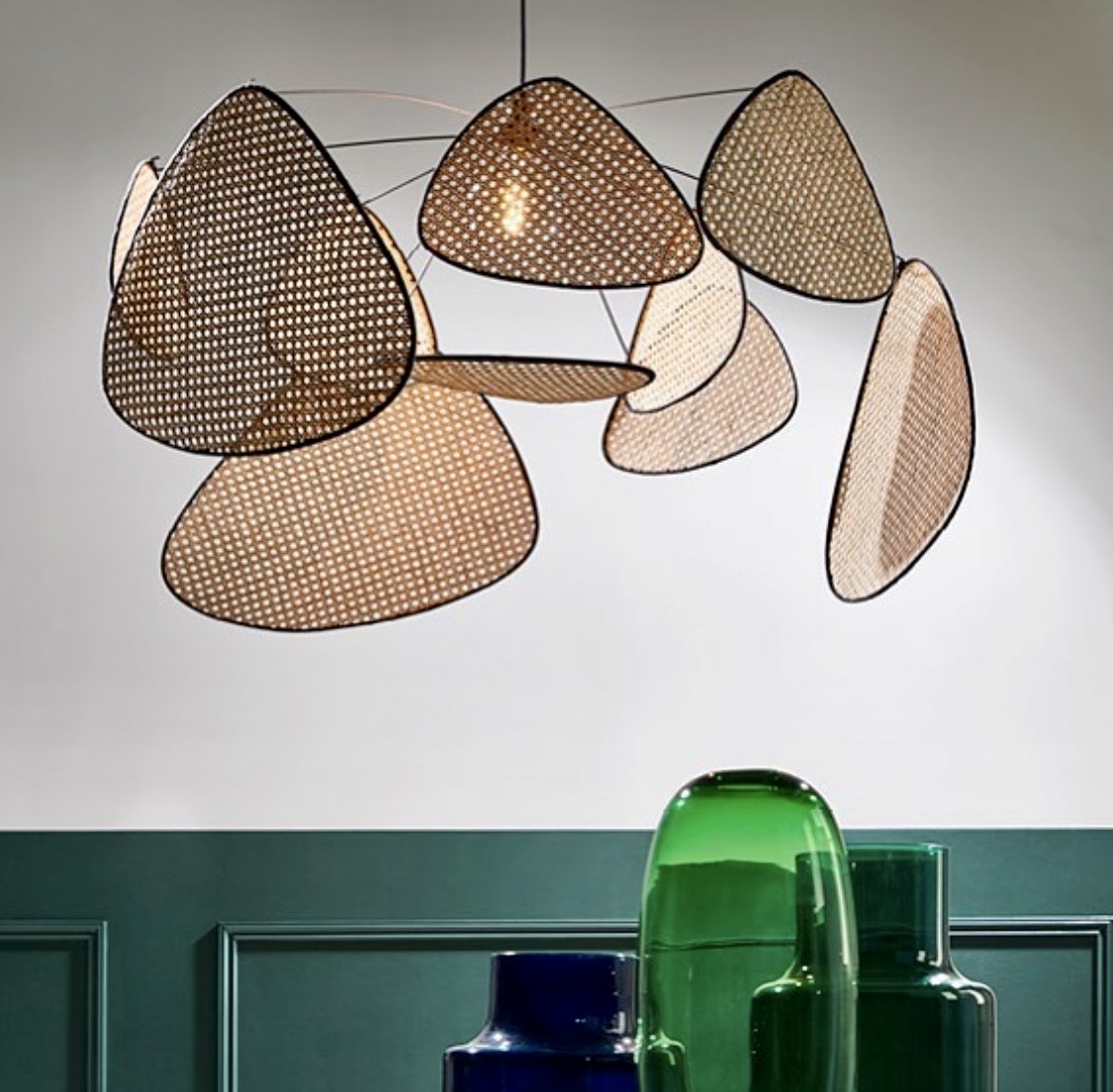 Luftig öppen mobilliknande taklampa i svartlackerad stål med skärmar i rotting.