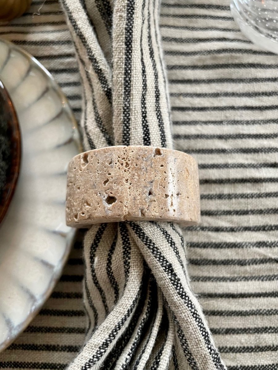 Vacker enkel servettring i travertin, som är en typ av kalksten. Eftersom det är ett naturmaterial så är ingen ring lik den andra, alla ser olika ut och kan därmed skilja sig från den på bilden, charmigt tycker vi.